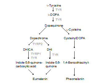 Eumelanin is synthesized after several transformations caused by the action of other enzymes such as TYRP1 and TYRP2 (Fig. 5). Pheomelanin follows a different route and uses the sulfur amino acid L-cysteine.